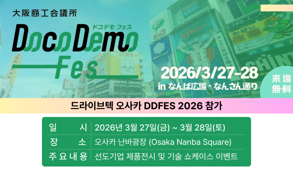 DDFES 2026’에 참가합니다. 오사카 상공회의소가 주최하는 이번 행사는 전 세계 스타트업의 최첨단 기술을 시민들이 도심 속에서 직접 체험하는 일본 최대 규모의 옥외 전시형 비즈니스 페스티벌입니다.